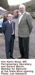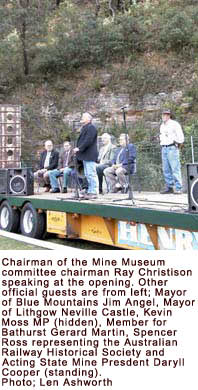 He was accompanied by official guests including Member for Bathurst Gerard Martin, Mayor Neville Castle, Mayor of Blue Mountains Jim Angel, chairman of the Mine Museum committee Ray Christison, and Spencer Ross, representing the Australian Railway Historical Society. Introducing the guests, Mr Martin said it had taken many years of trials and tribulations to reach the present stage of development of the museum on the site of the old State Mine.